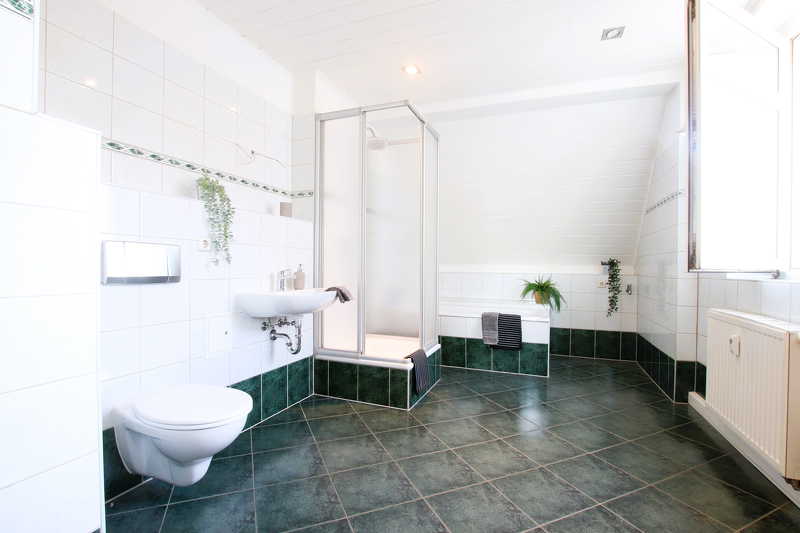 - Badezimmer mit Badewanne, Dusche und Fenster