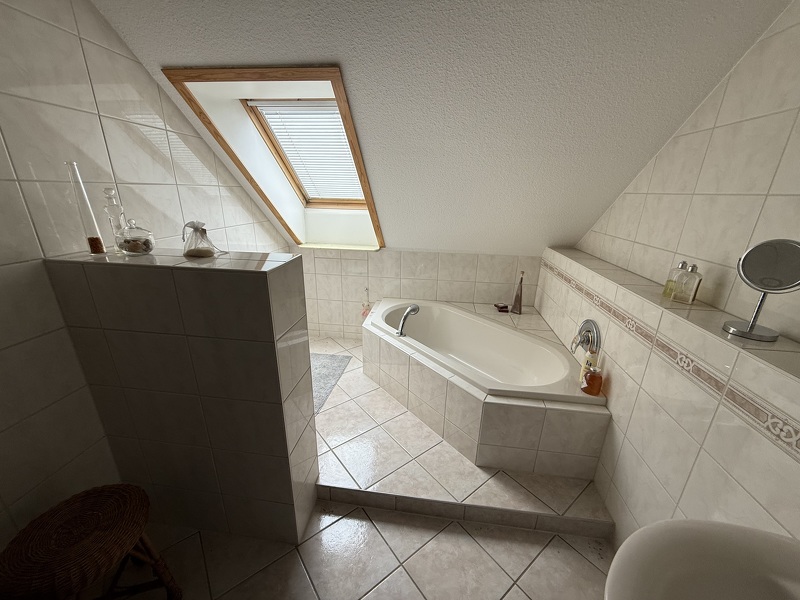 - Obergeschoss: Schlafzimmer, Kinderzimmer mit Balkon und Badezimmer mit Badewanne